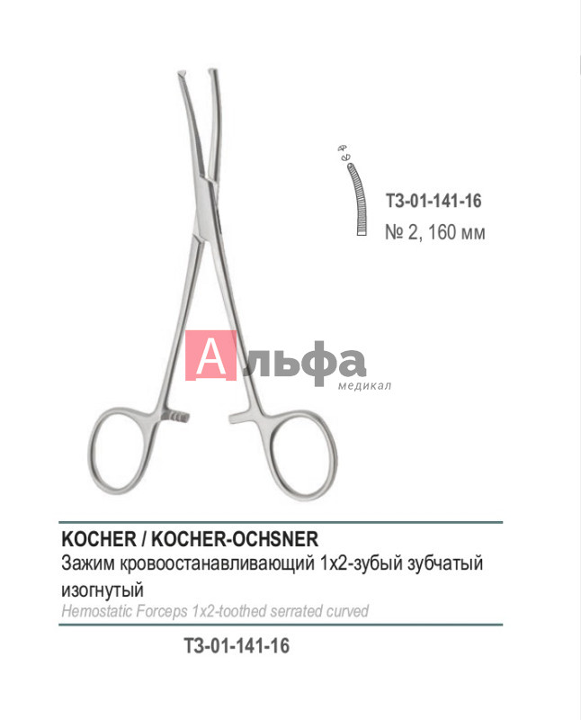 Купить KOCHER-OCHSNER, кровоостанавливающий 1х2 зубый, зубчатый, изогнутый № 2, 160 мм (З-5-1р) вы можете в компании Альфа-медикал, оформив заказ в интернет магазине, или